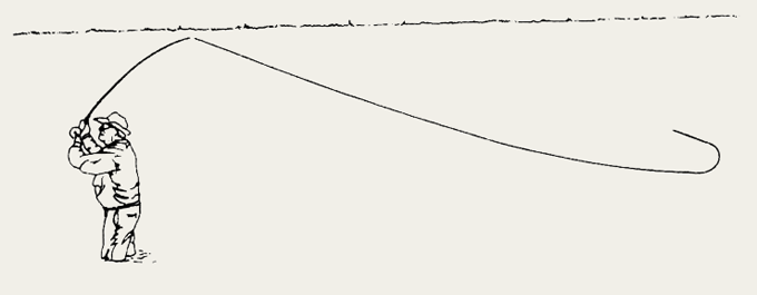 Ваше удилище представляет собой не более чем упругий рычаг. Чем дальше этот рычаг движется во время заброса, тем больше он способствует его дальности и тем менее работы нужно произвести для его производства. Традиционный метод не позволяет проводить удилище очень далеко и, поскольку он использует столь небольшое его движение, любой желающий сделать дальний заброс вынужден обращаться к технике двойной тяги. Традиционный метод настолько неэффективен, что двойная тяга необходима для заброса практически на любую дальность.