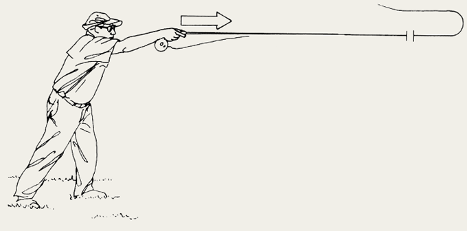Начиная заброс, полностью вытяните руку, как показано на рисунке. Редко нам предоставляется возможность сделать хороший замах назад, поэтому нам придётся выбрать всю слабину шнура перед забросом мушки. Преимущество этого заброса состоит в том, что вы сможете избавиться от слабины шнура в большей степени, нежели используя обычный заброс.