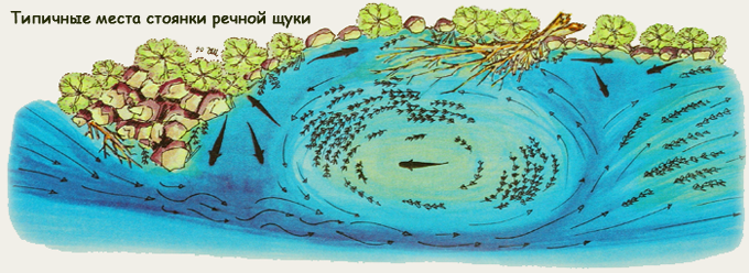 Типичной резиденцией щуки является зона обратного течения за торчащими из воды обломками скал, которые создают препятствия течению, около бун или за крутыми береговыми выступами (см. рисунок). Сильное кругообразное течение обычно вымывает в таких местах глубокие ямы. Я называю эти зоны «магическими треугольниками». В вершине «треугольника» течение очень слабое, поэтому там часто скапливается большое количество крупных экземпляров. Это может быть также «голова» обратного течения, или «хвост», где течение раздваивается. В «хвосте», как правило, стоит один или два экземпляра размерами поменьше. В период высокой воды количество стоянок в реке сокращается, поскольку щуки перемещаются ближе к берегу. Щуки в это время расходуют больше энергии, так как им приходится преодолевать более сильное течение и в связи с этим они становятся значительно более активными. В пик высокой и еще мутной воды имеются максимальные шансы поимки щуки. Щука всегда находится в засаде, высматривая свою жертву, поэтому стример с правильно подобранными цветами не может остаться незамеченным. При постоянно повышающемся уровне воды щуки не покидают своих стоянок до тех пор, пока чрезмерное давление течения не заставит их искать более спокойные места ниже по течению.