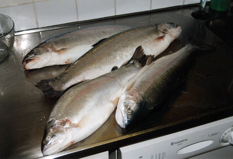 В мае же наблюдается повышенная активность радужной форели, которая бежит из морских садков и стала здесь вполне обычной рыбой. Правда, в море она достигает немалого веса, не в пример рыбе из пресных искусственных водоемов (шведский рекорд беглянки, выросшей в море, - 12,5 кг, а рыбе весом 3-4 кг уже никто не удивляется). Ловят ее так же, как и кумжу, но не целенаправленно, а попутно с другой рыбой.